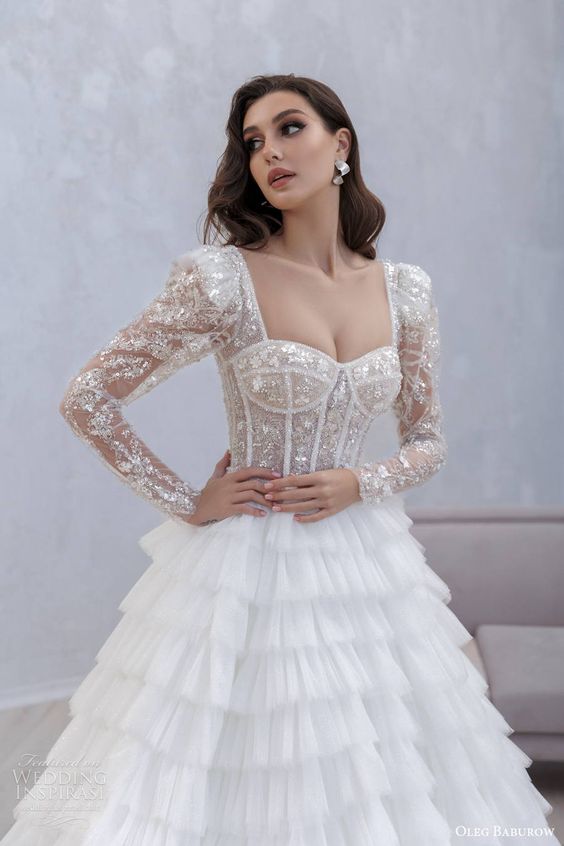 For the bride who wishes to dazzle like Bella Swan on her wedding day, this dress offers a show-stopping combination of vintage-inspired corsetry and shimmering, sequined long sleeves. It’s a gown that Padme might have chosen in a galaxy far, far away, with tiered ruffles that add a dramatic flair reminiscent of Game of Thrones. The plunging neckline and fitted bodice serve a unique, modern elegant look that’s both classy and romantic.