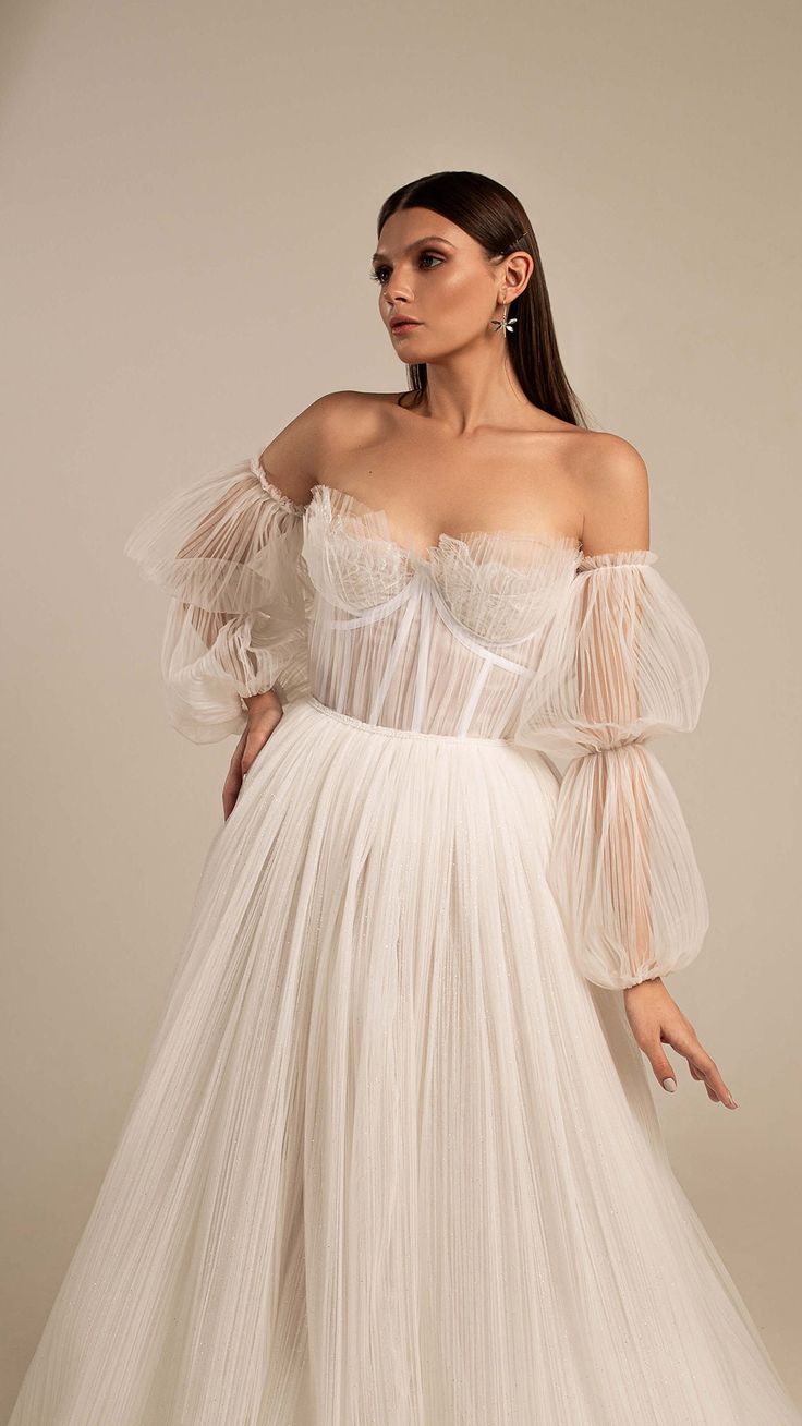 Envision a gown that captures the boho spirit and classy soul, this one offers just that with its off-shoulder design and ethereal tulle sleeves. The cinched waist and semi-sheer corset top exude a romantic, elegant vibe, ideal for a vintage or modern simple themed wedding. This dress whispers sweet nothings to the bride who dreams of a simple yet aesthetic day, where the focus is on love and the elegant simplicity of being surrounded by nature and loved ones.