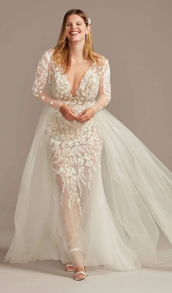 A modern elegant wedding dress in size 12 that celebrates curves with confidence and grace. With its form-fitting bodice and strategically placed lace appliqués, this gown accentuates the silhouette in a way that is both flattering and modest. The sheer sleeves provide coverage while allowing a glimpse of skin, striking the perfect balance for a winter wedding or a classy evening affair.