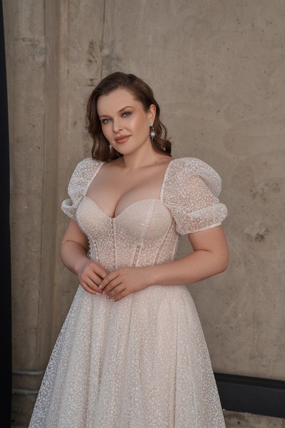 This gown exudes Victorian charm with a modern twist. The corseted bodice provides excellent support for a big bust, while the dotted puff sleeves add a poetic flair. It’s a dress that celebrates the fuller figure, highlighting the best neckline for small and large busts alike with its sweetheart design. This dress is a beautiful blend of structure and whimsy, perfect for the bride seeking a plus size bridal gown that’s as comfortable as it is captivating.
