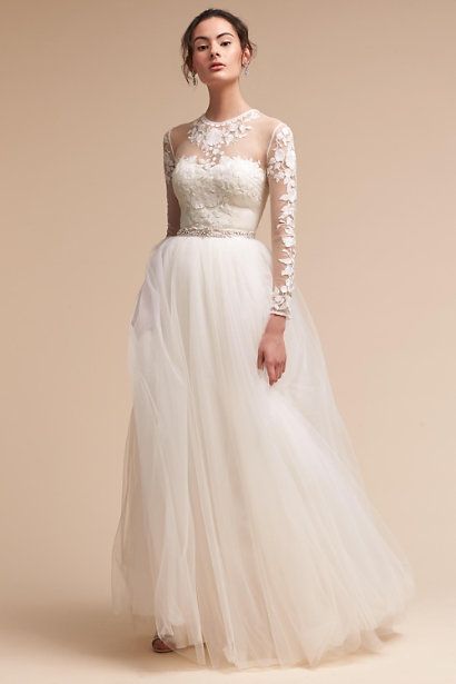 At the heart of bridal fashion lies the interplay of texture and silhouette, beautifully exemplified by this gown’s intricate lace sleeves and sheer overlay. The jewel neckline accentuates the neck’s delicate curvature, inviting an air of modesty while remaining undeniably sensual. The top cascades into a flowing tulle skirt, a simple elegant design that speaks to the modern bride who admires vintage undertones. This gown would suit a fall wedding, its long sleeves whispering of autumnal grace, while the lightness of the fabric promises movement and ease.