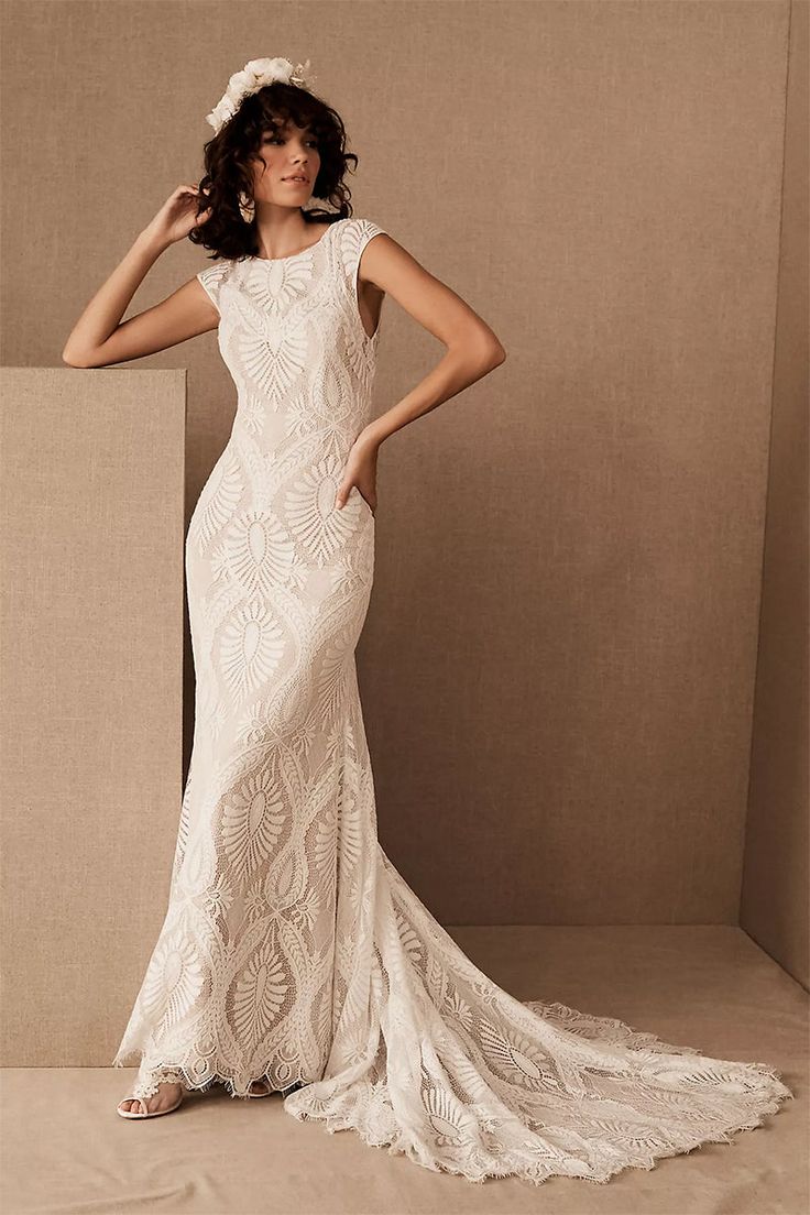 Boho meets haute couture in this lace-encrusted gown. The jewel neckline offers a conservative contrast to the body-hugging mermaid cut, which flares into a dramatic train, embodying the 2024 trend. This gown is an anthem to the plus size bride who values style and comfort, as well as to any guest seeking a classy elegant yet simple elegant piece for a bohemian-themed celebration.