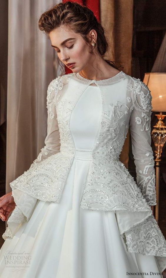 In this image, the dress captivates with a jewel neckline that offers a fresh take on bridal aesthetic vintage. The long sleeve design is transformed by contemporary embroidery on lace, achieving a balance between classy elegant and modern simple. This look is perfect for the bride who seeks a simple yet impactful gown, one that complements her Italian or Muslimah heritage, or for a guest at a themed wedding who desires to embody subtle sophistication.