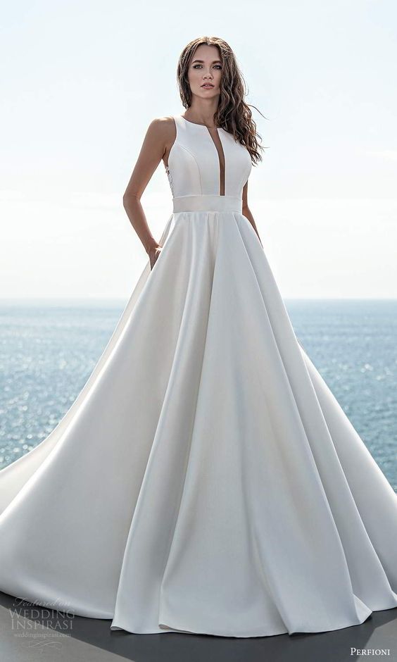 Minimalism takes center stage in this gown, featuring a jewel neckline and a clean, modern simple cut. The absence of straps and lace allows the silhouette itself to make a statement, resonating with modern elegant and simple elegant vibes. Ideal for the bride who embodies modern simple sophistication or for a guest at a contemporary wedding where style is expressed through subtlety and purity of form.