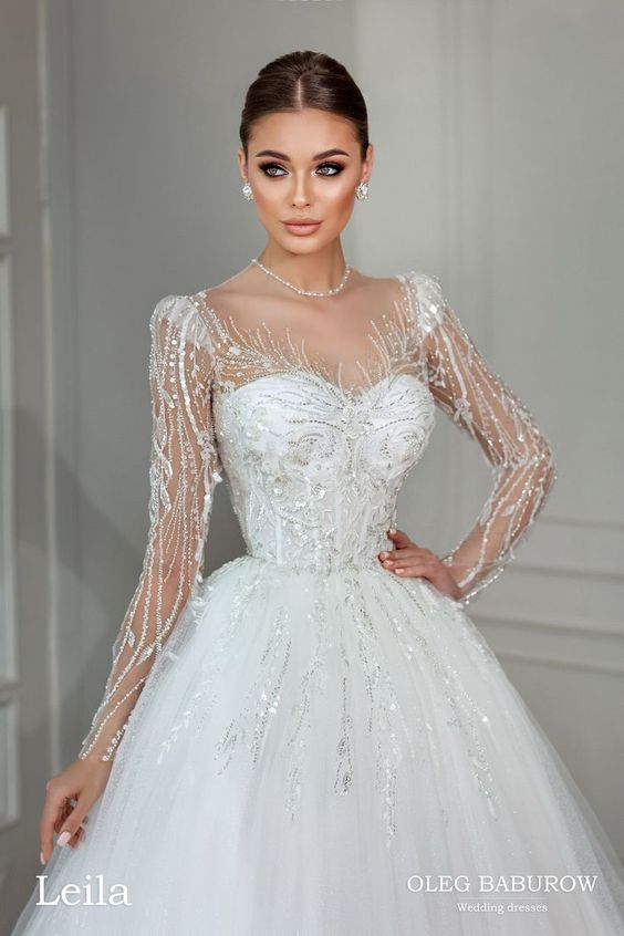 Here, the jewel neckline is adorned with beaded and encrusted wedding details, adding a luxurious touch to the dress’s ethereal silhouette. The illusion sleeves drape softly, reminiscent of a vintage piece, yet the craftsmanship is all 2024. This dress would dazzle in a princess-style wedding, where every detail is infused with elegance and style.