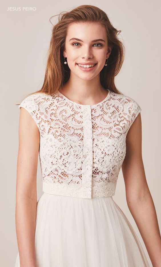 Here, the jewel neckline is just the beginning of an enchanting journey through a garden of lace and embroidery on. This dress with its cap sleeves and delicate detailing is an ode to vintage beauty, making it a perfect fit for a princess-themed wedding or for bridal parties that value a classy elegant and simple elegant look.