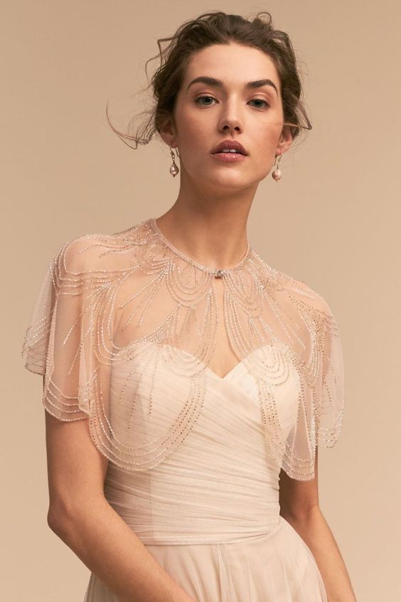 A confection of beaded delicacy, this dress with a jewel neckline is a dream for those who seek a vintage-inspired aesthetic with modern undertones. The intricate embroidery on the bodice trickles down a sheer overlay, offering a whisper of romance. It’s perfect for the bride who wants a touch of fantasy in her simple elegant style, or a guest at a themed bridal affair.