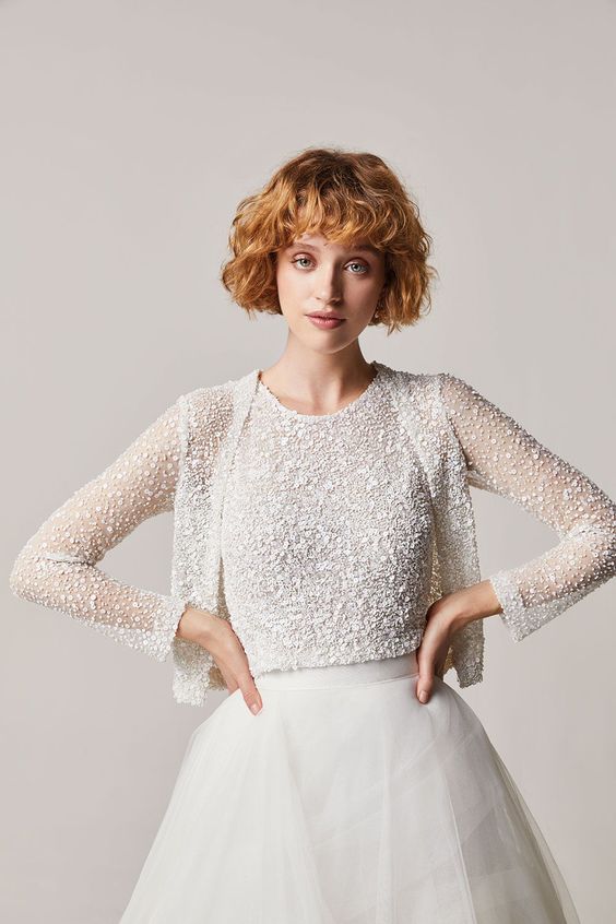 The final ensemble redefines modern elegant with a top entirely covered in sequins under a jewel neckline, juxtaposing the simple cut of the bodice with the sparkling complexity of the embroidery on. This gown, perfect for a boho wedding or an avant-garde bridal parties event, speaks to the 2024 trend of bold yet simple elegant choices. The long sleeve design adds warmth, making it a suitable option for a fall celebration or for a guest looking to shine.