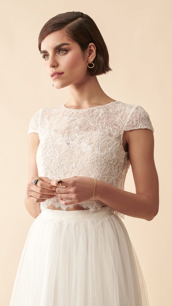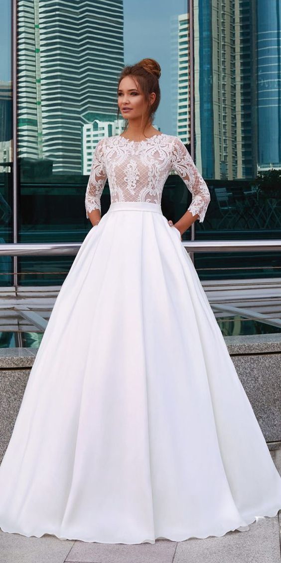 Marrying the cosmopolitan vibe with bridal traditions, this gown stands as a monument to the 2024 trend new. The long sleeve lace top with a jewel neckline flows into a pristine tulle skirt, offering a simple elegant aesthetic that is both modern simple and classy elegant. Perfect for the bride with an eye for Italian sophistication, this dress would shine in an urban setting, reflecting the architectural lines of the cityscape behind.