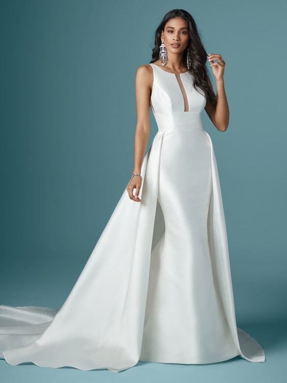 A daring cut meets classic elegance in this stunning piece, where a jewel neckline evolves into a bold statement with a tasteful front cut-out. The silhouette, reminiscent of a mermaid gown, offers a modern simple alternative to traditional princess dresses. This gown, with its illusion of simplicity and Italian flair, is a choice par excellence for brides or guests aiming for a modern elegant presence.