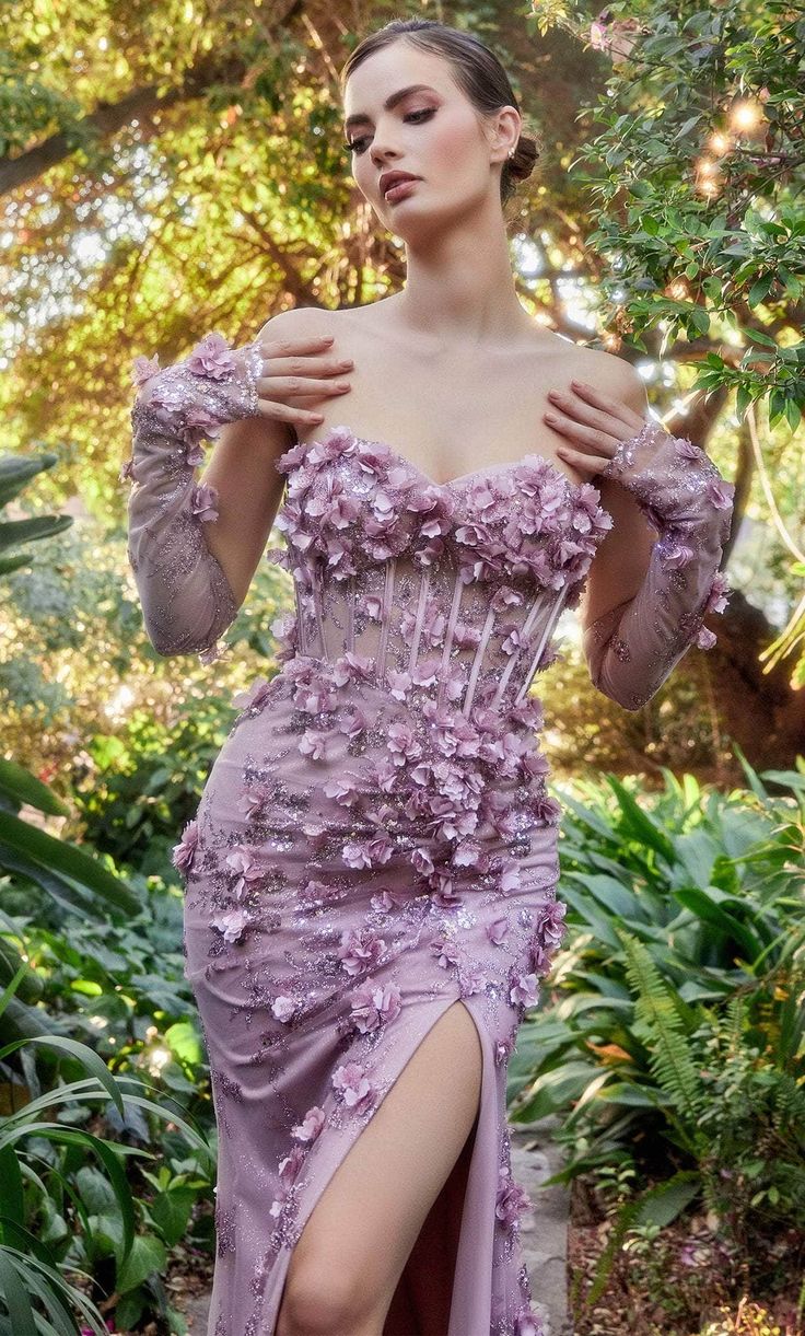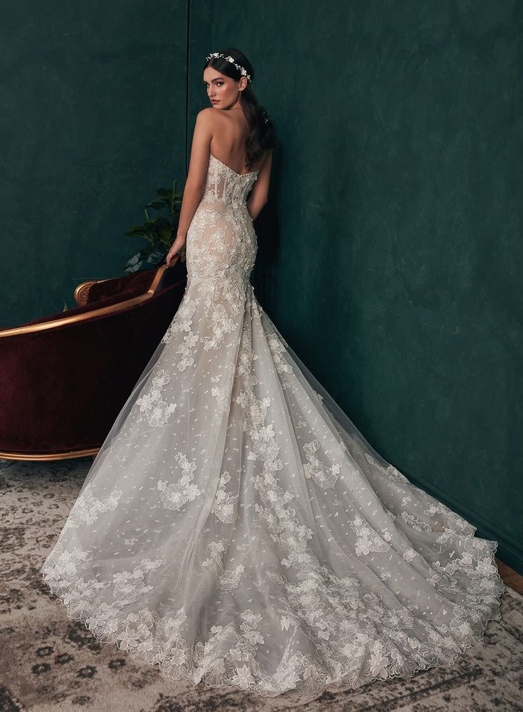 This lilac masterpiece exudes a pretty, romantic boho vibe. With a fitted silhouette featuring a corset-style bodice and off-shoulder sleeves, the gown showcases a blend of simple a line and ornate aesthetics. The floral appliqués add a three-dimensional aspect that’s very modern elegant, perfect for a garden wedding. Complement this gown with soft curls and delicate floral jewelry.