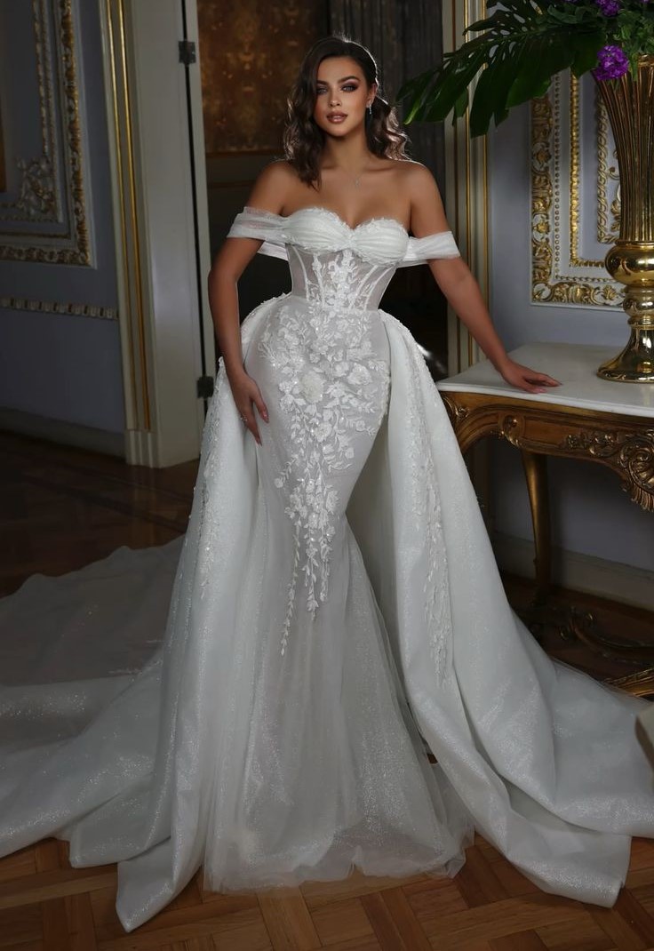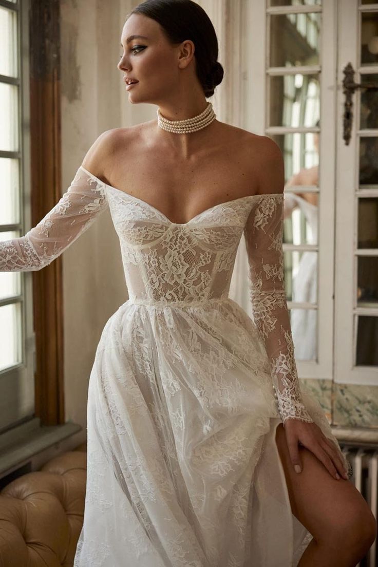 Embodying classy elegance, this gown is a love letter to traditional bridal fashion with a modern twist. The fitted bodice, adorned with delicate floral lace, cascades into a flowing skirt with a daring slit, bringing a balance of modesty and allure. The off-shoulder sleeves add a romantic touch, perfect for the bride seeking a simple a-line dress that exudes sophistication. Styling this dress with minimalistic jewelry and a soft updo will let its natural beauty shine.