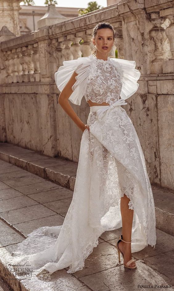 This gown breaks all the rules, blending modern simple with avant-garde boldness. The cropped top and high-low skirt, adorned with intricate lace, present a simple boho look for the bride who embraces cutting-edge fashion. Pair with statement heels and minimalist accessories to maintain a sleek, contemporary vibe.