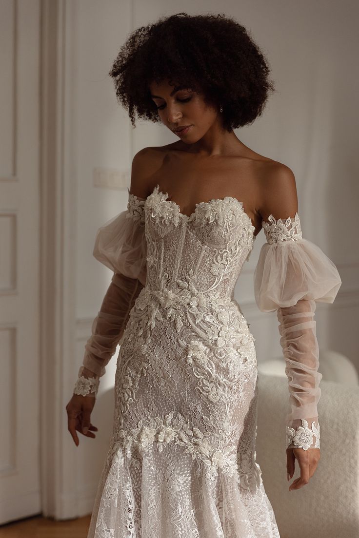 This majestic gown features a corset-style bodice and a sweeping train, making a grand statement. With a modern elegant style that showcases pretty lace details and an off-shoulder design, it’s a perfect match for the bride aiming for a ballgown princess aesthetic. Enhance this look with a sparkling headpiece and elegant gloves.