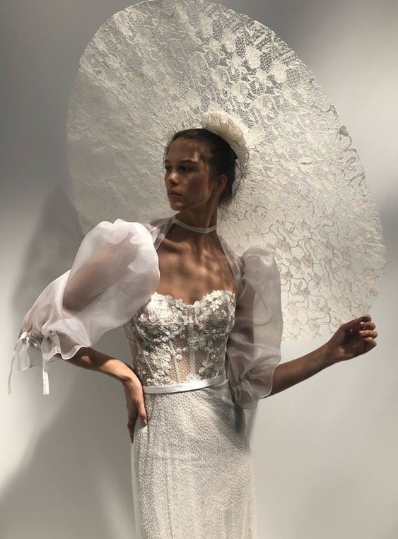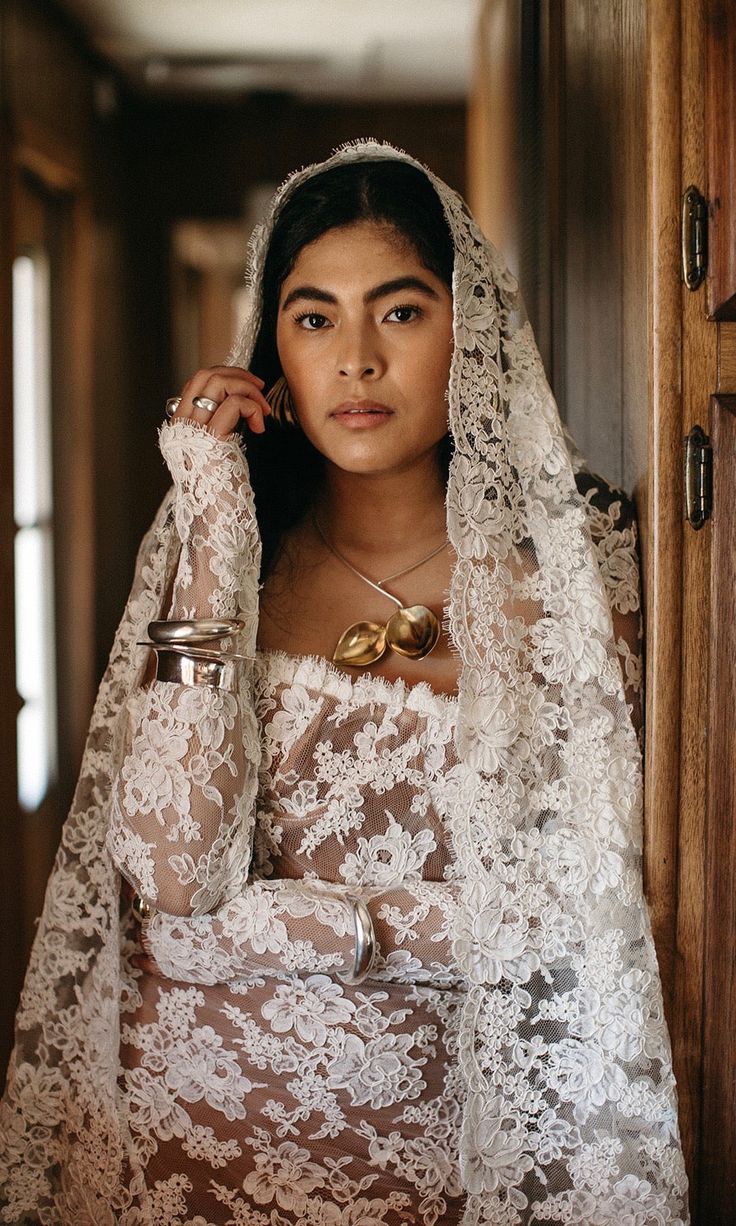 With a nod to cultural heritage, this lace gown marries tradition with haute couture. The sheer fabric and long sleeves create a sense of modesty while the design remains firmly modern simple. This gown is ideal for a bride valuing her roots while embracing modern elegance. Pair with traditional jewelry to honor the past while celebrating the present.