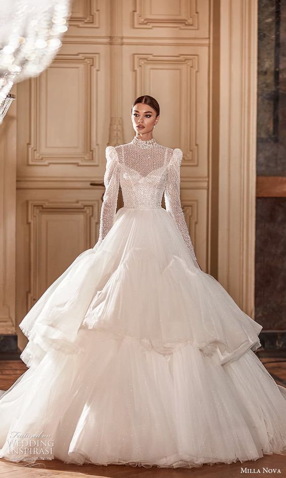 A ballgown fit for princesses, this dress boasts a long sleeve square neck top that glistens under the light, with a skirt voluminous enough to make a statement while maintaining a modern simple aesthetic. The layers of sheer fabric create a romantic boho feel, while the fitted bodice showcases the bride’s silhouette. Pair this gown with a classic pearl necklace to accentuate the regal neckline.