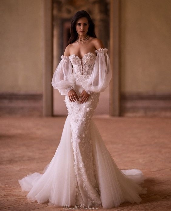 This dress is for the bride who stands at the forefront of fashion, blending a high-fashion hat with a traditional lace gown. It’s a daring take on the elegant long sleeve trend, perfect for a fashion-forward wedding. Keep accessories to a minimum; let the dress and its unique headpiece be the center of attention.