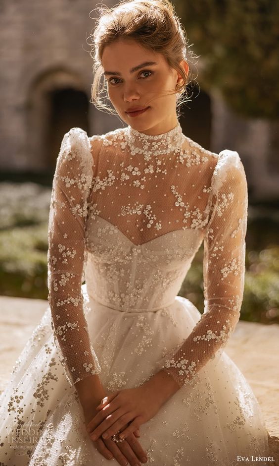 For the bride with a bohemian heart, this dress with its intricate boho long sleeve design and transparent lace speaks of free-spirited love. The high neckline and fitted silhouette are the epitomes of modern elegance, with a touch of vintage charm. To style this gown, consider a loose, braided hairstyle adorned with flowers to complement the bohemian vibe.