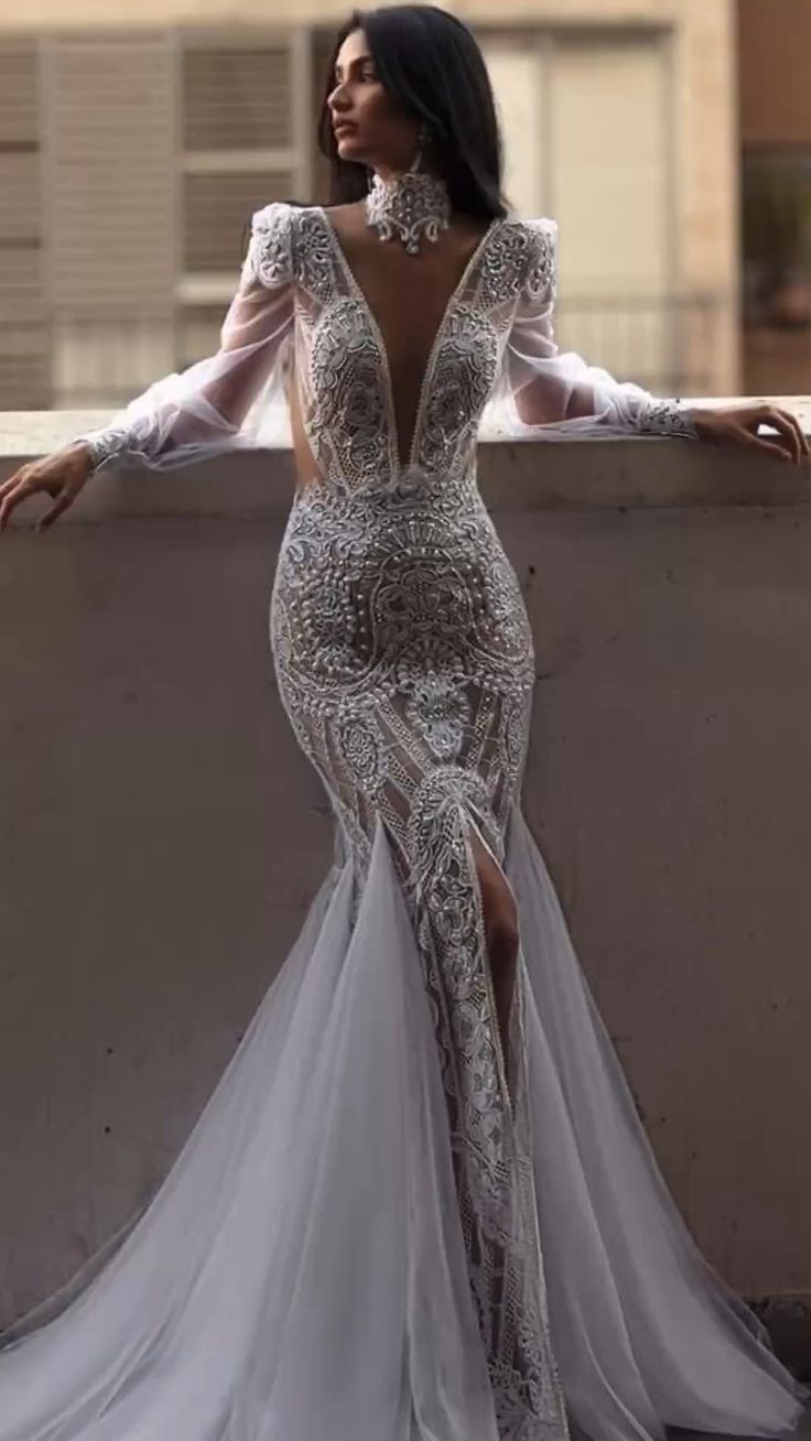 A vision in white, this dress captivates with its detailed lacework and dramatic train, encapsulating elegant long sleeve and backless trends with finesse. The transparent lace adds a layer of mystique, making it an ideal choice for a romantic boho or rustic wedding theme. Style this ethereal gown with a delicate diamond pendant and soft, swept-back hair.