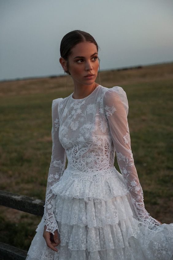 Capturing the essence of rustic charm, this gown with its tiered skirt and long sleeve design is a nod to vintage elegance with a simple boho spirit. The lace pattern, reminiscent of heirloom craftsmanship, is ideal for a countryside or barn wedding. For styling, consider antique silver jewelry and a soft, braided updo to enhance its pastoral allure.