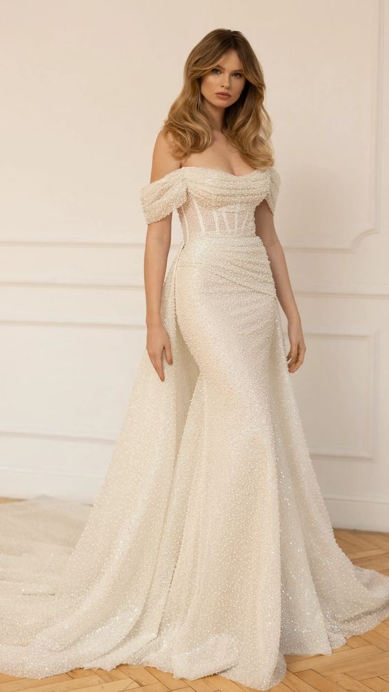 Grace personified, this gown boasts a mermaid silhouette that glides seamlessly into an expansive, shimmering train. The off-the-shoulder design, coupled with a cinched waistline, creates a vision of timeless grace. The entire gown is a sea of sparkle, promising that every eye will be captivated.