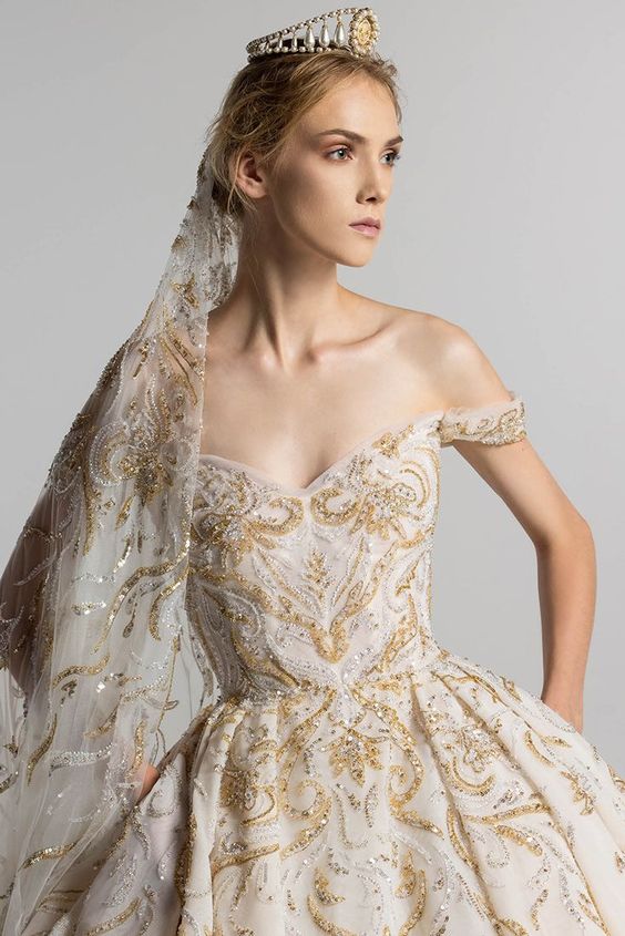 Fit for royalty, this gown sparkles with golden embroidery, creating a rich contrast against the sheer sleeves and off-the-shoulder neckline. A matching beaded crown and veil complete the regal ensemble. This dress is a statement piece, shining with every step down the aisle.