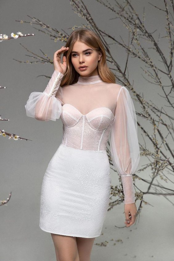 This gown breaks the mold with a daring short cut, perfect for the modern bride who cherishes mobility and spunk. The bodice is a work of art, with sheer long sleeves and a high neckline, creating a blend of boldness and classic beauty. It’s a simple, yet sophisticated choice for a contemporary wedding.