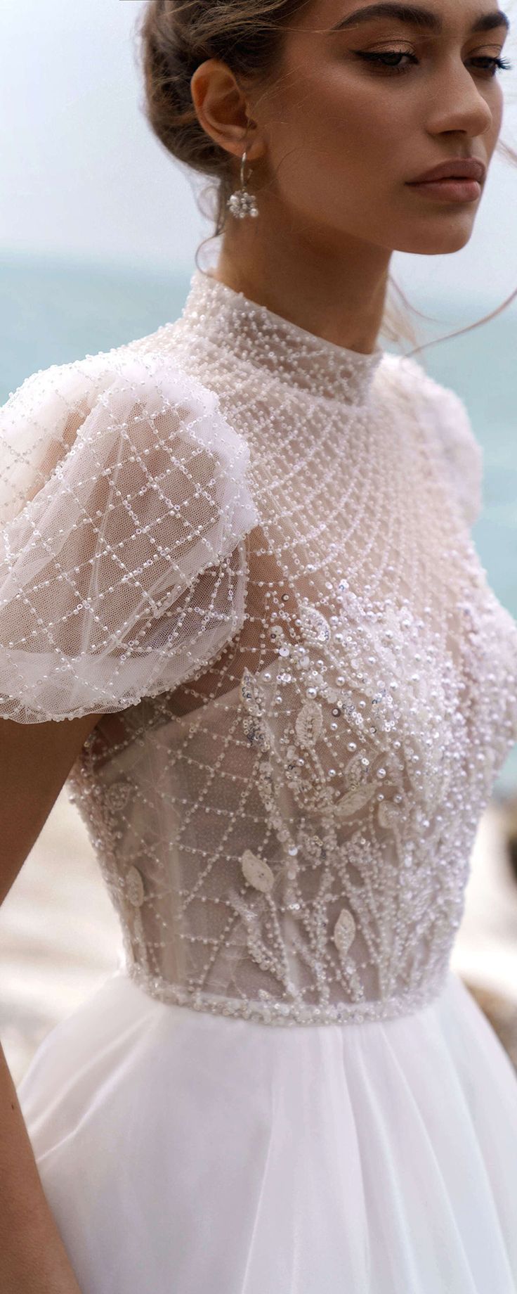 A portrait of sophistication, this gown features a high-neck design graced with delicate beading and lace, cascading down a fitted bodice. The sheer sleeves bloom with beaded embellishments, offering a touch of whimsy to the elegant silhouette. It’s a dress that speaks to the romance of the wedding day.