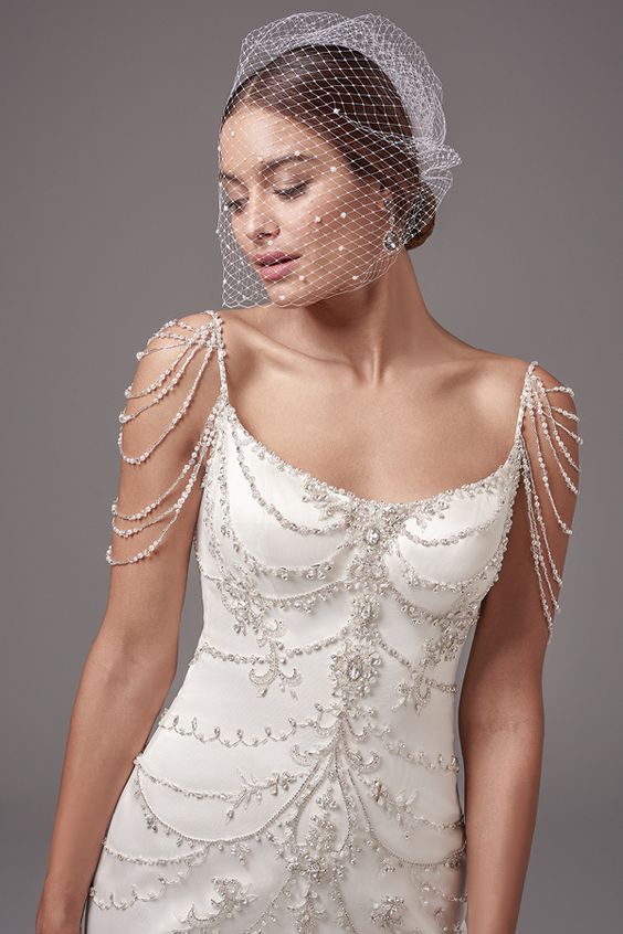 Vintage meets modern in this captivating dress featuring dainty beaded straps and an alluring square neck. A whimsical beaded birdcage veil completes the look, offering a nod to the past while firmly remaining in the modern bridal scene. The embellished gown weaves a story of timeless sophistication.