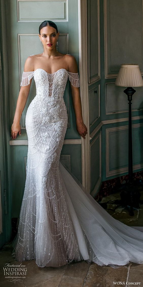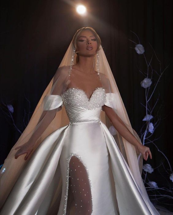 This gown redefines elegant simplicity with a sleek fit and flare design and an off-the-shoulder neckline. Lace accents on the sleeves and along the bust add a traditional touch, while the high slit introduces a modern element. It’s a testament to the timeless beauty of wedding dresses beaded – 2024, where classic meets contemporary.