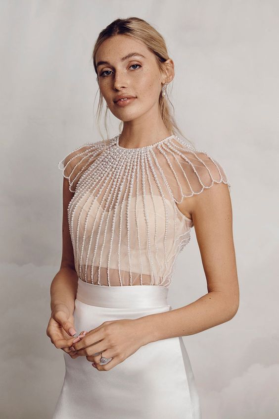 A contemporary twist on pearl beading, this gown features a high neckline with a cape-like sleeve design. The simple yet striking beading pattern cascades down, creating a modern and elegant visual appeal. This gown is a testament to the bride’s individuality, a perfect blend of modern aesthetics with a touch of traditional embellishment.