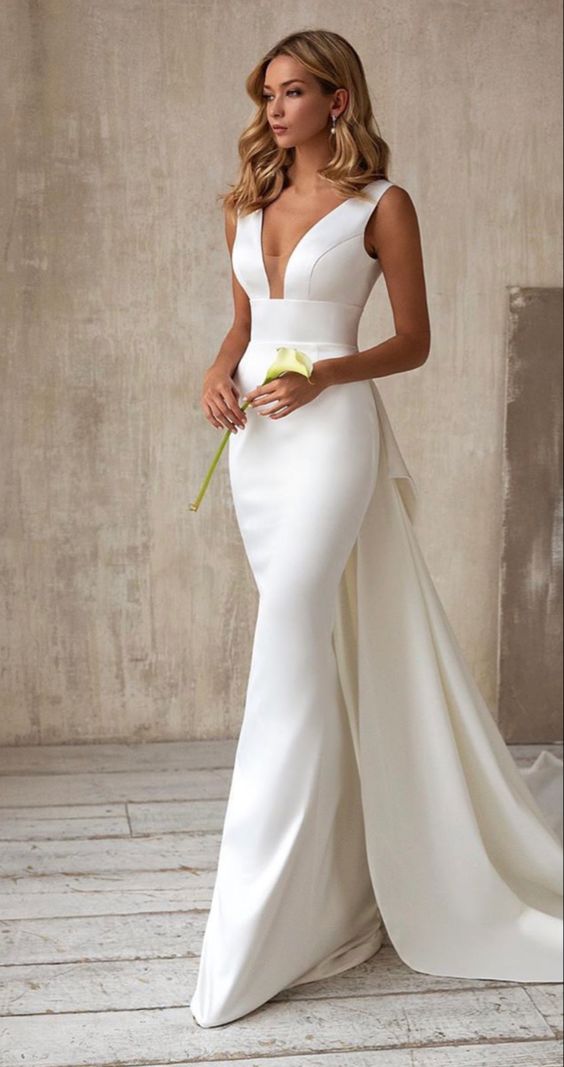 Boldness meets beauty in this striking gown featuring a plunging neckline and a simple long trail. It speaks to the bride who carries her elegance with confidence, embodying a minimalist yet stunning approach. The dress, while simple, makes a powerful statement with its fitted waist and subtly flared train, proving that sometimes less is indeed more.