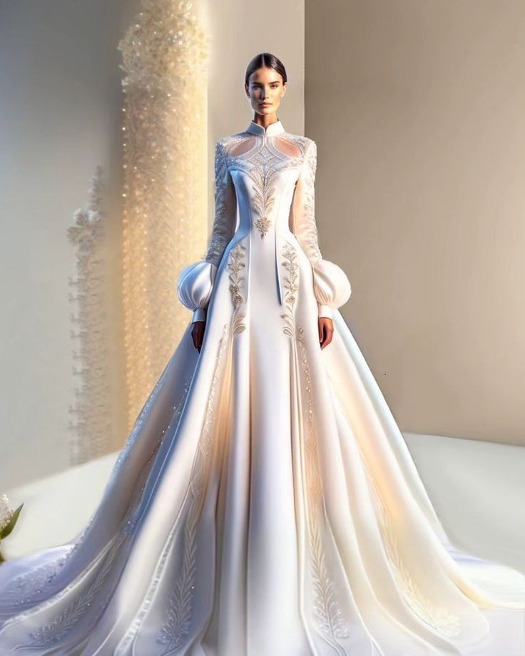 This gown is a vision of regal radiance, with its intricate embroidery and a commanding silhouette that takes inspiration from Indian wedding grandeur. The high neckline and long sleeves add a touch of majesty, making it a fit for a queen on her most auspicious day.