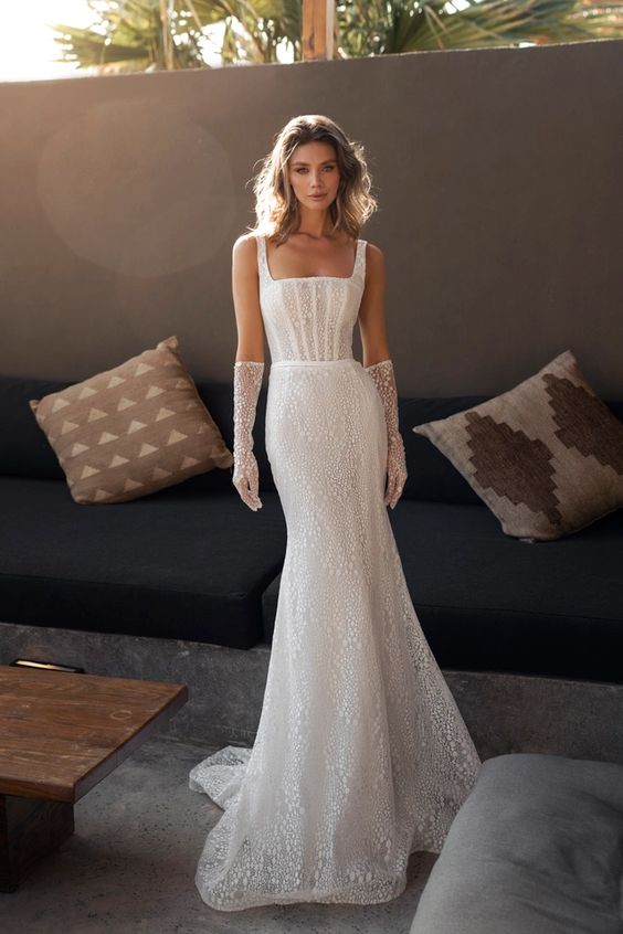 For the bride who embodies effortless chic, this V-neck gown with its clean lines and flowing train provides a simple long profile that is both modern and timeless. It captures the essence of the feather-light grace that many brides seek, offering a silhouette that’s both flattering and comfortable.