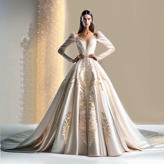 An epitome of royal grandeur, this gown takes one’s breath away with its majestic golden embroidery, reminiscent of a fairytale come true. The high neck fish cut accentuates the neckline, while the intricate gold appliqué work brings an opulent texture to the size mermaid silhouette. Ideal for a grand wedding or an opulent photoshoot, this dress is a testament to the craftsmanship and luxurious detailing that define the 2024 tail wedding dress trend.