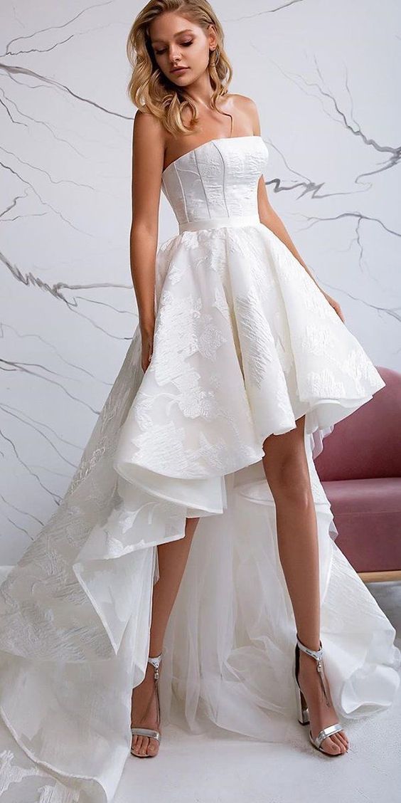 This dress redefines the fairytale aesthetic for the modern bride. The strapless bodice, cinched at the waist, extends into a dramatic high-low hemline, showcasing an exquisite short front long back design. The layered tulle, adorned with delicate floral embroidery, creates an ethereal effect, perfect for a bride looking for a blend of tradition and fairy-tale magic. This gown is not just a dress but a canvas that paints a story of romance and dreams.