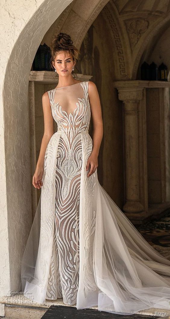 The epitome of sparkling elegance, this gown features a deep V-neck, a mermaid silhouette fully encrusted with shimmering beads, and a sheer long sleeve lace overlay that adds a celestial touch. It’s a constellation woven into fabric, designed for the bride who is not just walking down the aisle but making an entrance into her new life with the grandeur of a star-studded night.
