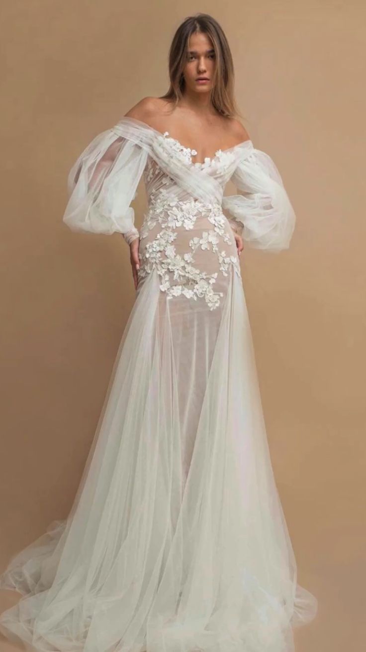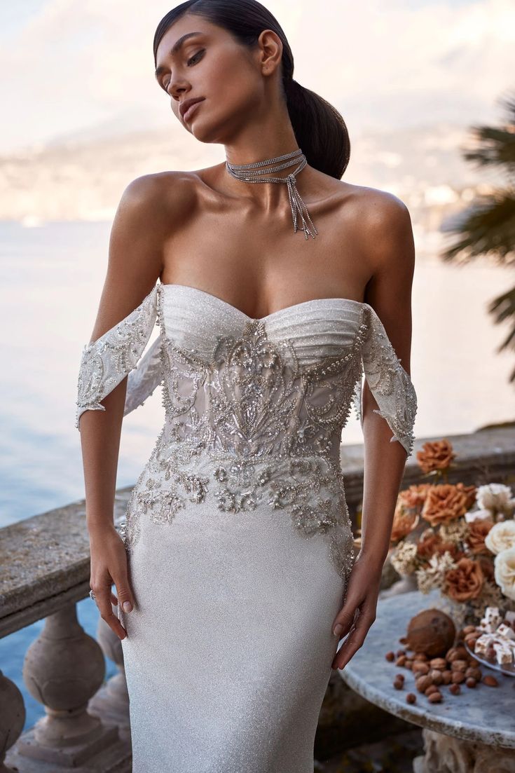 The off-the-shoulder sheath dress merges bohemian ease with an air of aristocracy. This style, with its alluring neckline and whisper of sleeves, embodies the free-spirited bride who still desires a touch of regal elegance. Whether on a sunlit beach or in a grand ballroom, this dress speaks of a relaxed yet sophisticated celebration.