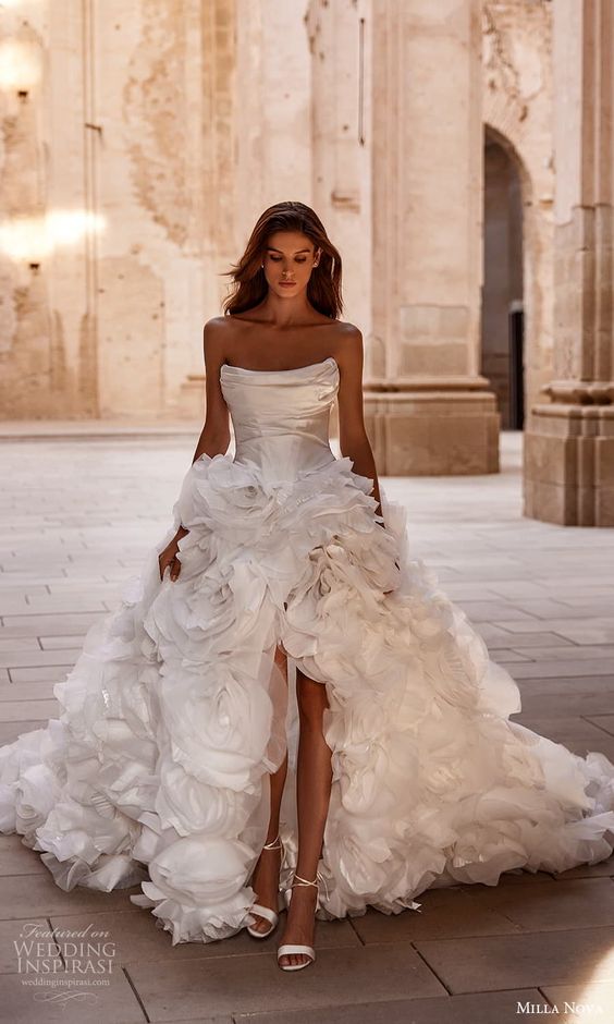 Celebrating simple elegance, this dress features a bustier top with bold ruffles that frame the shoulders, echoing the alt bridal trend. The smooth lines of the skirt contrast with the dramatic top, creating a modern simple silhouette that’s both striking and elegant. This design caters to the bride with a bold fashion sense, looking to make a statement while keeping to a classy elegant theme.