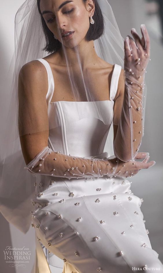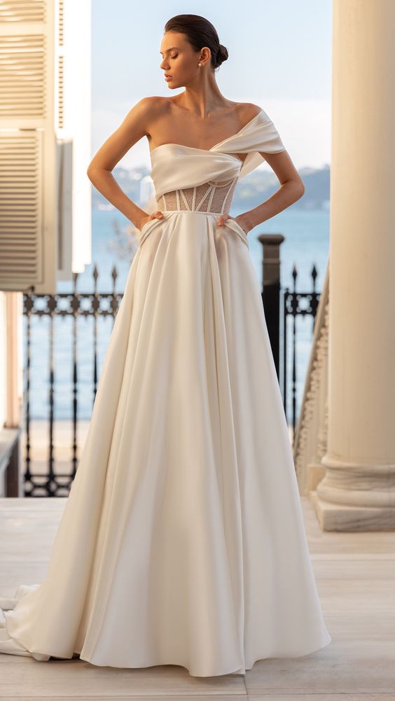 A testament to modern simple design, this dress strikes with its structured bodice and a striking off-shoulder neckline. The A-line cut is complemented by long sleeve gloves, adding a touch of classy elegance. Its clean lines and absence of ornamentation make it a canvas for personal style, allowing the bride to shine. Ideal for an after party or a minimalist-themed ceremony, it’s a dress that embodies 2024 trend new with a confident, modern elegant allure.