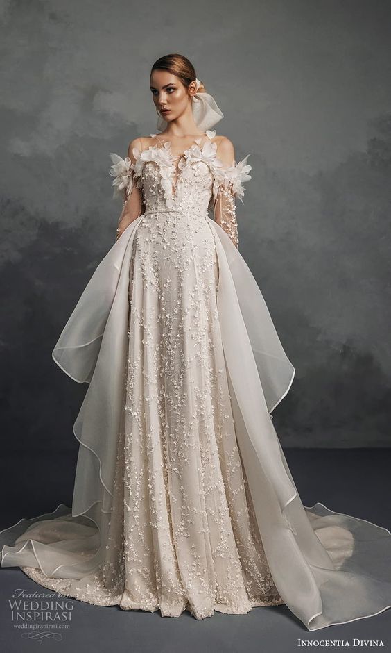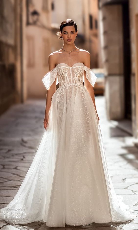 This gown is a love letter to the romantic at heart. A semi-sheer corset top with off-shoulder sleeves and a dusting of glitter across the A-line skirt evoke a fairytale-like presence. It’s a harmonious blend of modern simple and aesthetic vintage, perfect for a bride seeking a simple elegant look with a touch of whimsy. This dress captures the 2024 trend, offering a long sleeve option that’s both modern elegant and timelessly simple.