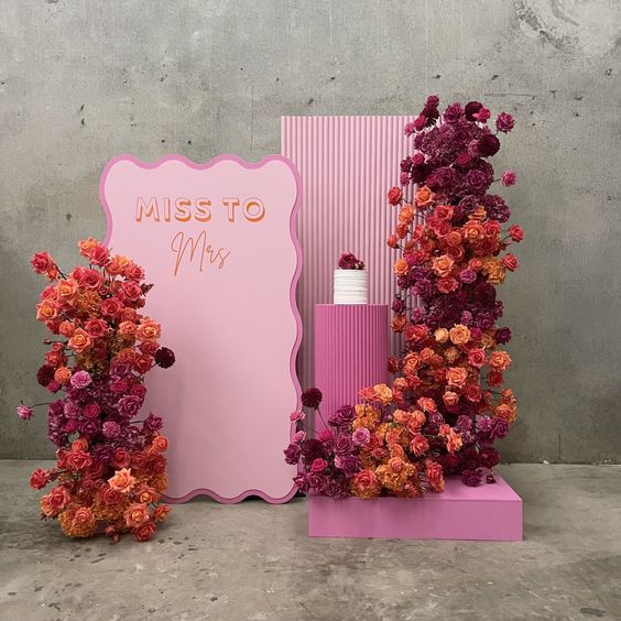 Imagine stepping up to a reception where the transition from ‘Miss’ to ‘Mrs.’ is celebrated with a stunning floral arrangement that exudes both charm and grandeur. A backdrop that features varying shades of blooms arranged in a lavish cascade can create a flower background that’s both elegant and unique. This design can be a DIY project for the creatively inclined or a commissioned piece for those seeking professional finesse. Embrace the new trend of personalization by incorporating flowers that have a special significance to your love story.