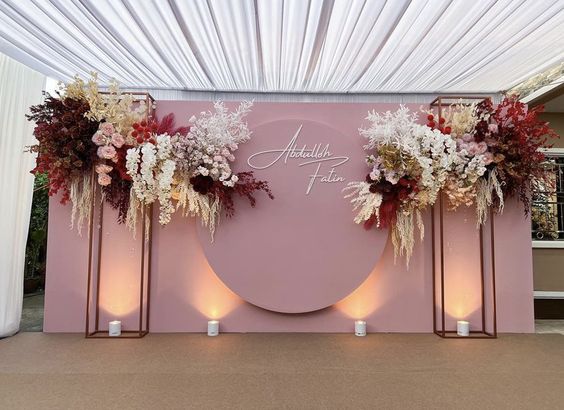 Envision a reception with a backdrop that blends the tenderness of blush with the depth of autumn colors, creating a harmonious and elegant ambience. This backdrop is a unique masterpiece for a design indoor reception, providing a warm and inviting atmosphere that’s perfect for intimate small gatherings or grand celebrations alike.