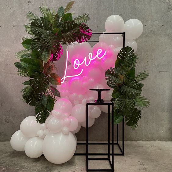 For those who dream of a vibrant and fun wedding, a tropical-themed backdrop with a neon sign is the ultimate outdoor or indoor statement piece. This unique backdrop combines lush greenery with modern elements, creating a design that’s both playful and memorable for any reception.