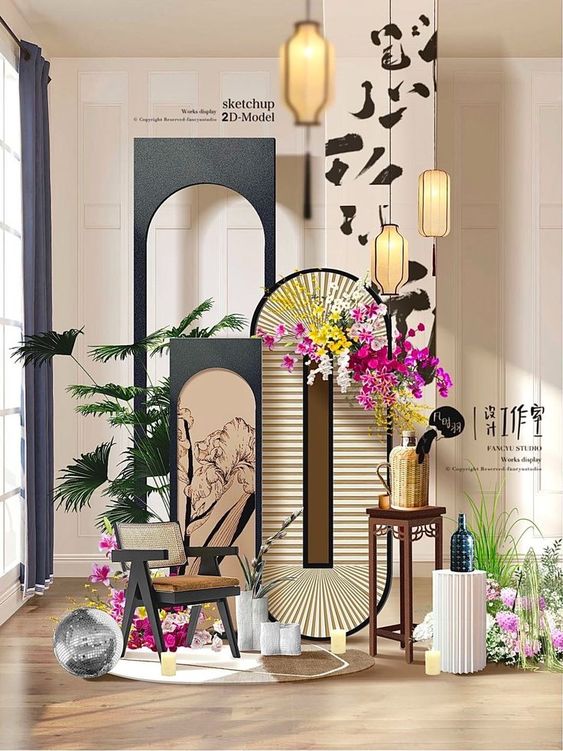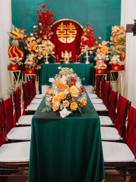 This unique backdrop beautifully marries Eastern aesthetics with Western design sensibilities, creating a new and elegant fusion. It’s a simple yet rustic choice for an indoor wedding that wants to incorporate cultural elements into a modern setting.