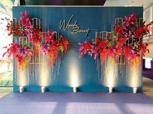 For those looking to add a splash of vibrancy to their reception, a modern backdrop with colorful blooms against a sleek blue panel is the way to go. It’s a unique blend of design backgrounds that can also double as a photobooth. The use of bright, hanging flowers and strategic lighting creates a captivating effect that will keep guests talking.