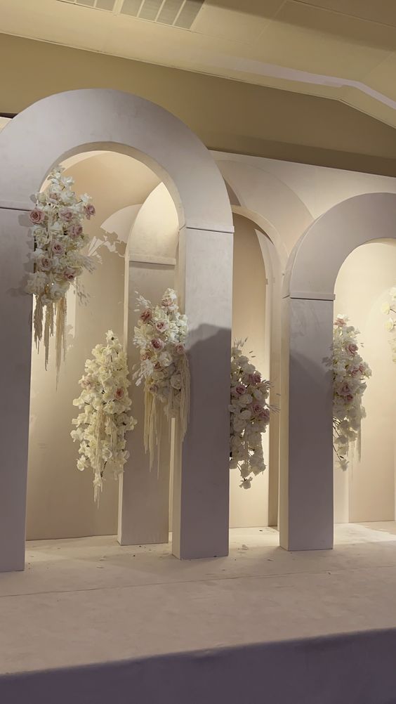 Arches have always been a staple in wedding decor, but 2024 brings a new twist to this classic element. White arches with cascading florals offer a design indoor option that is timeless and elegant. This simple yet sophisticated backdrop could be the perfect choice for a couple looking for a minimal, design-focused ceremony.