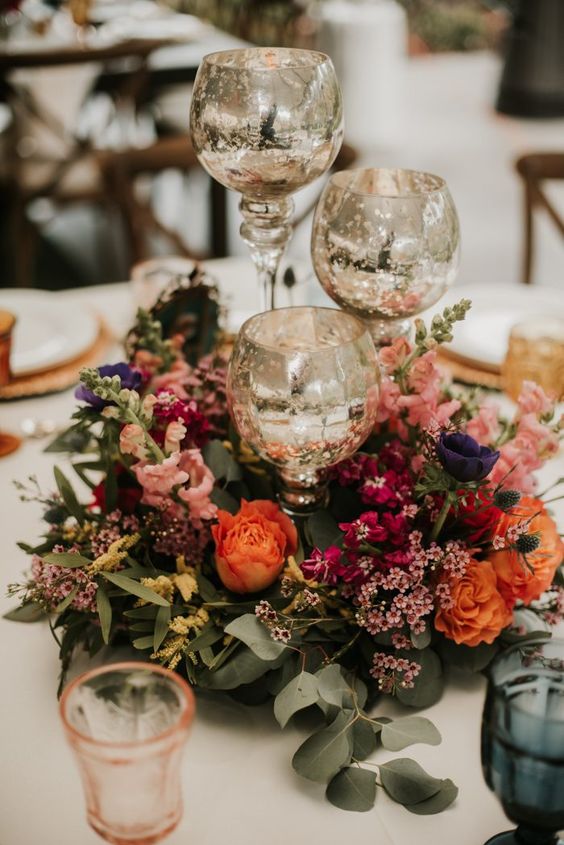 This arrangement is a bold statement in aesthetic diversity, ideal for the couple that embraces both autumn vibrancy and spring subtlety. With its mix of jewel tones and soft pastels, it stands out as a centerpiece tall, commanding attention without overshadowing the natural beauty of a table simple. It’s a perfect conversation starter for a modern wedding where decorations are a reflection of a unique love story.