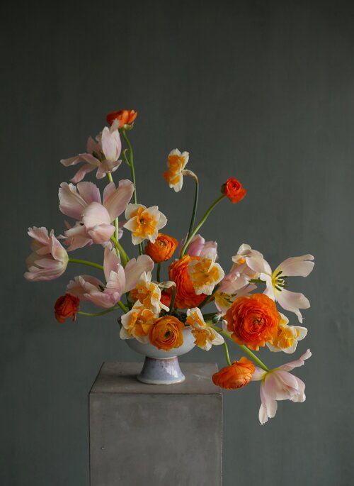 The tulip – often a symbol of perfect love – takes center stage in this contemporary arrangement, making it a fitting choice for the table decor at a spring wedding. The vibrant orange and soft pink tulips, set against the sleek lines of a modern vase, provide a centerpiece simple yet dramatic. This design could be a stylish centerpiece head table, where the bride and groom’s taste for modern simplicity shines through.