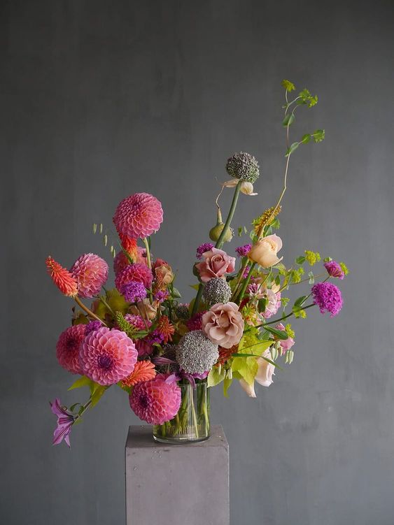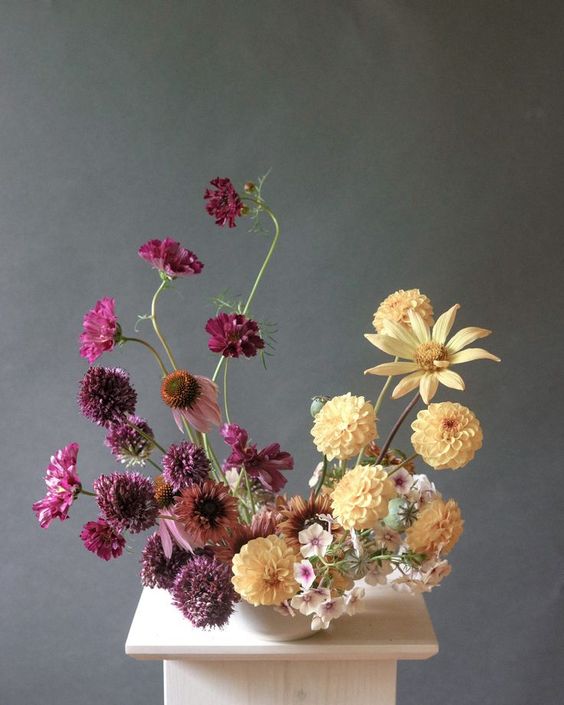 This centerpiece is a jubilant celebration of color and life, ideal for a spring or summer wedding. The pink and purple dahlias are the stars of this floral ensemble, with their intricate petals creating a visual feast. Paired with the subtle greenery, this arrangement on a plinth is a testament to modern design with a flirtatious wink to the boho aesthetic, perfect for an outdoor gala or a garden reception.